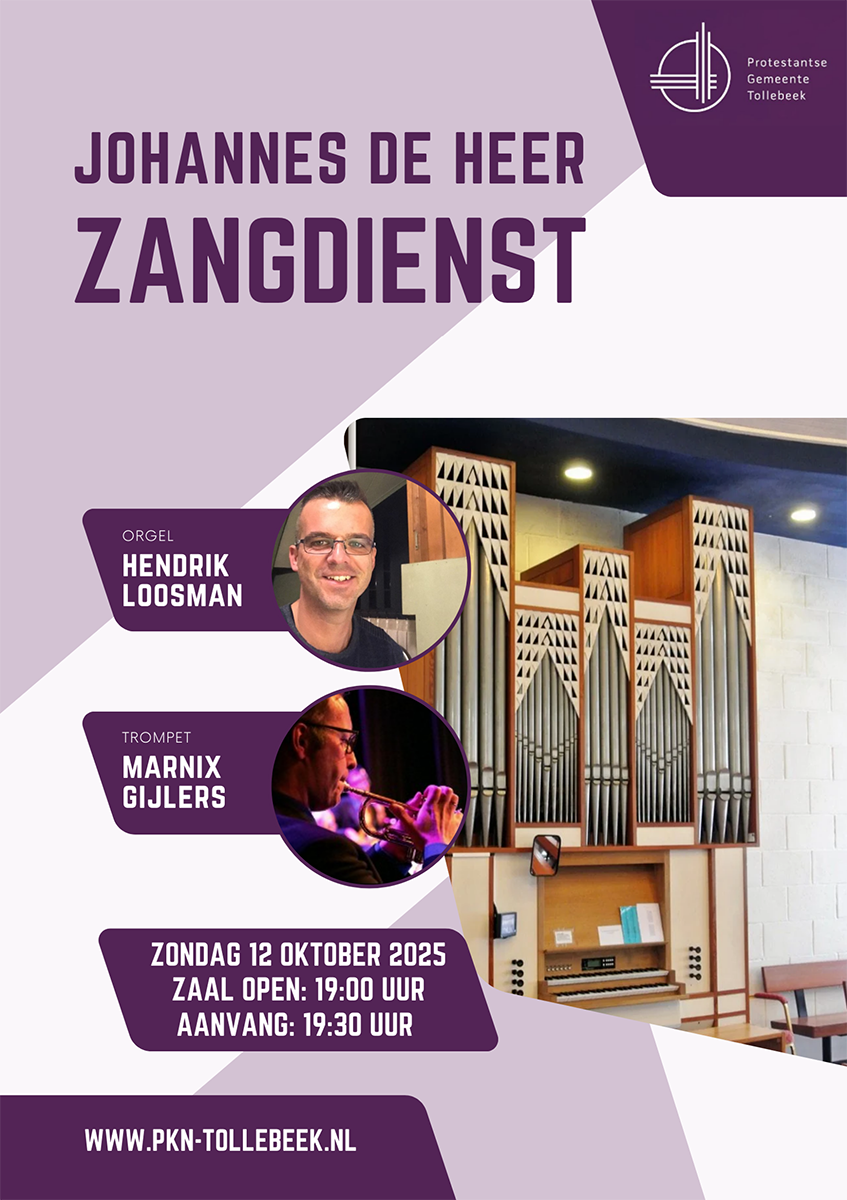 De zangdienst zal worden begeleid door Hendrik Loosman op het orgel en Marnix Gijlers op trompet. De dienst begint om 19:30 uur en de zaal is open vanaf 19:00 uur.