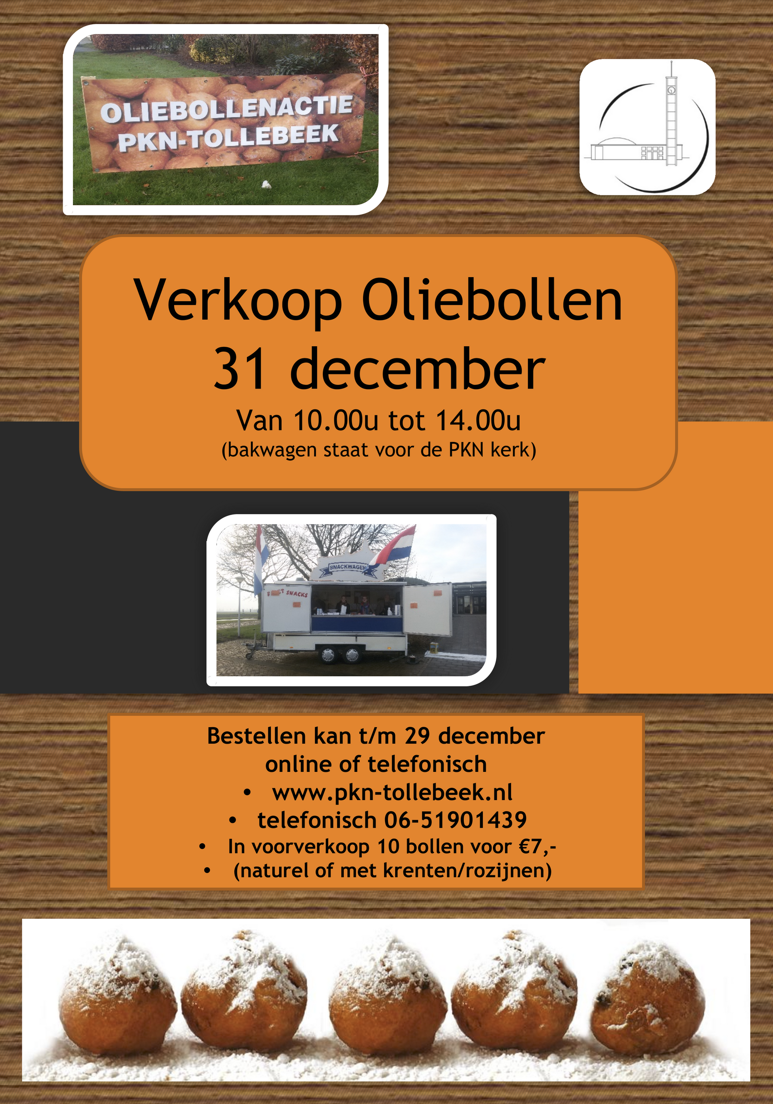 In de voorverkoop kost 1 zak met 10 oliebollen 7 euro. De oliebollen kunnen vrijdag 31 december tussen 10.00 en 14.00 uur worden afgehaald bij de Protestantse Gemeente Tollebeek.